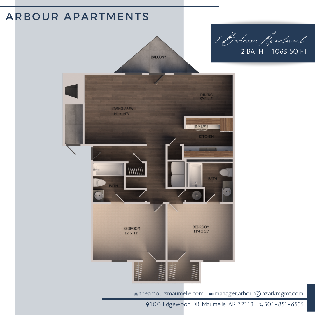 Every unit has either a balcony or a patio for enjoying the beautiful views of Maumelle. We are located in the heart of Maumelle within walking distance to multiple eateries and shopping. The Arbour is also located between Lake Valencia and Lake Willistine, both just a short walk away for easy enjoyment with the paved walking paths.